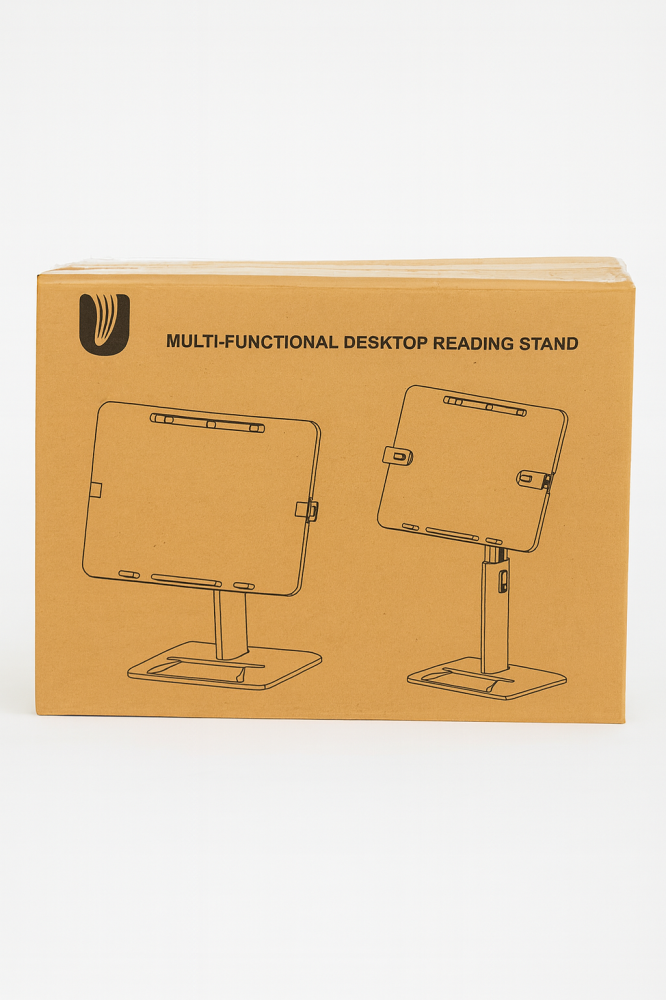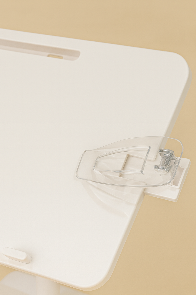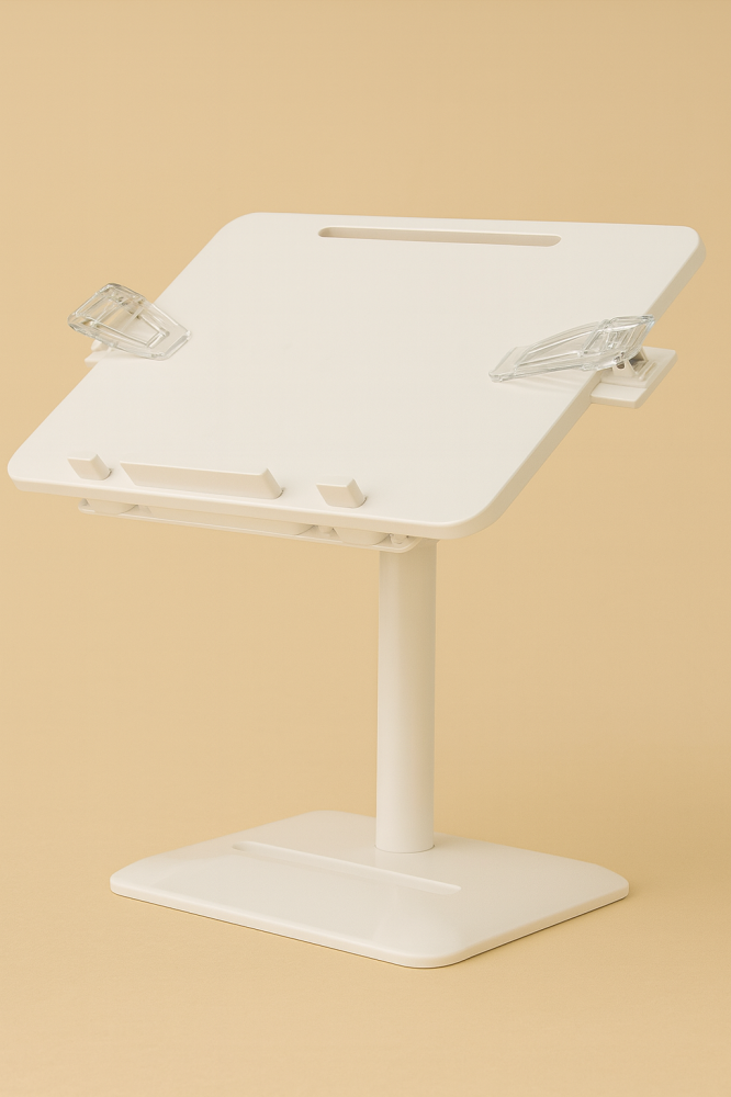 يأتي بسطح متين قابل للتدوير والتعديل في الارتفاع، مع مشابك شفافة لتثبيت الصفحات بثبات وأناقة.