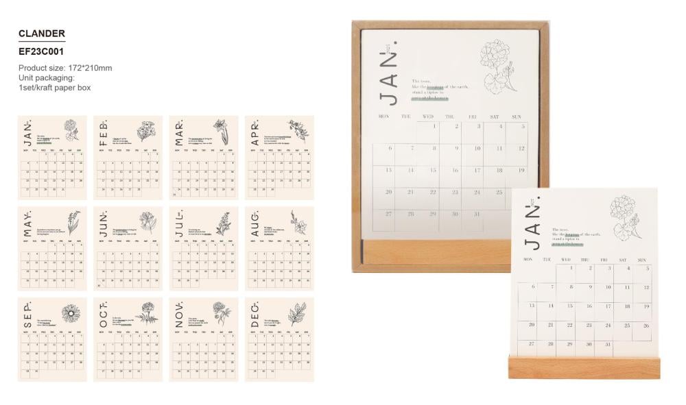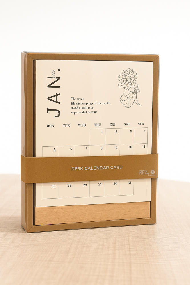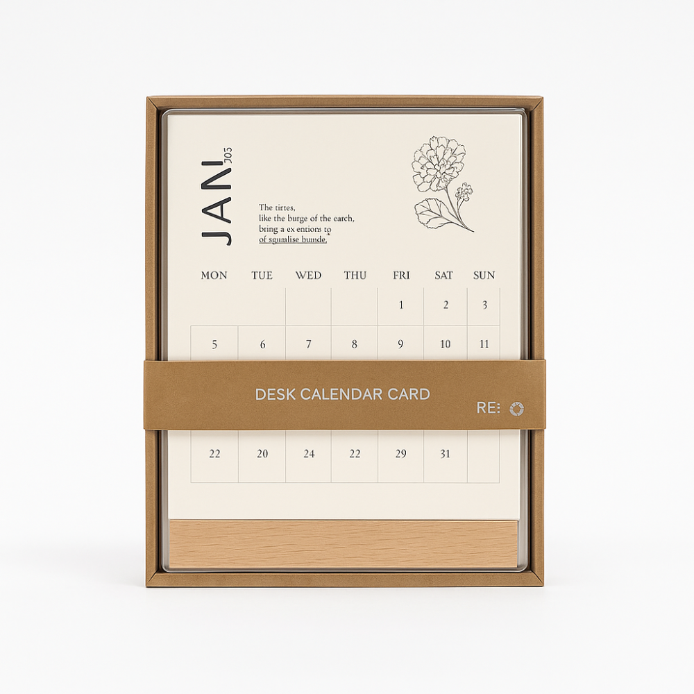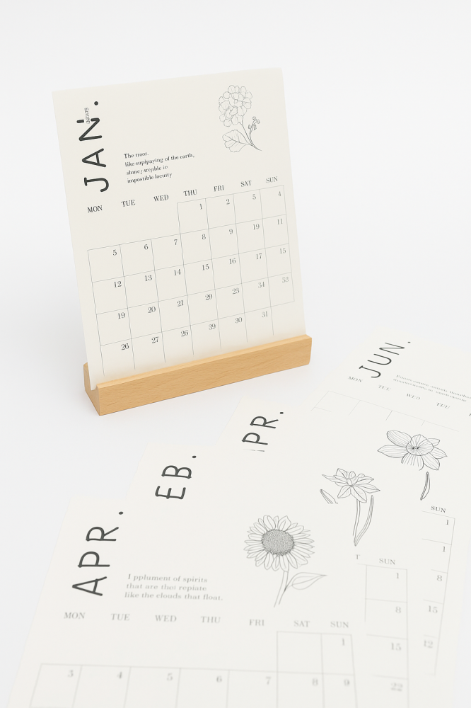 تقويم مكتبي بتصميم بسيط وراقي، يتكوّن من بطاقات شهرية منفصلة مزينة برسومات زهرية أنيقة مع قاعدة خشبية ثابتة. يمكنك الكتابة على البطاقات لتدوين مواعيدك، ملاحظاتك، أو اقتباساتك اليومية، ليصبح التقويم قطعة تنظيم وإلهام في آنٍ واحد.
