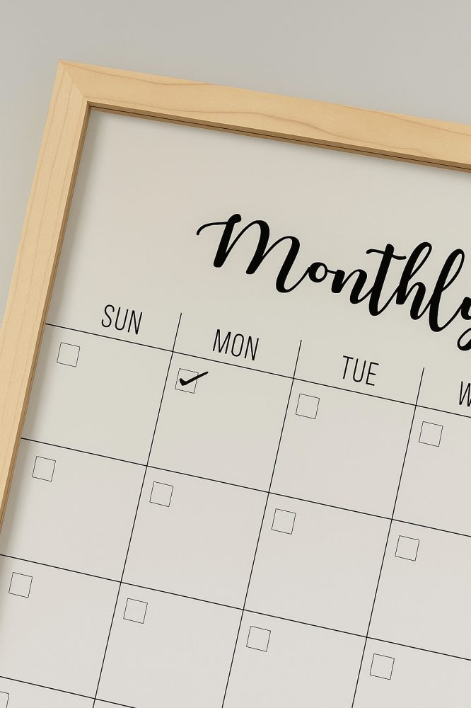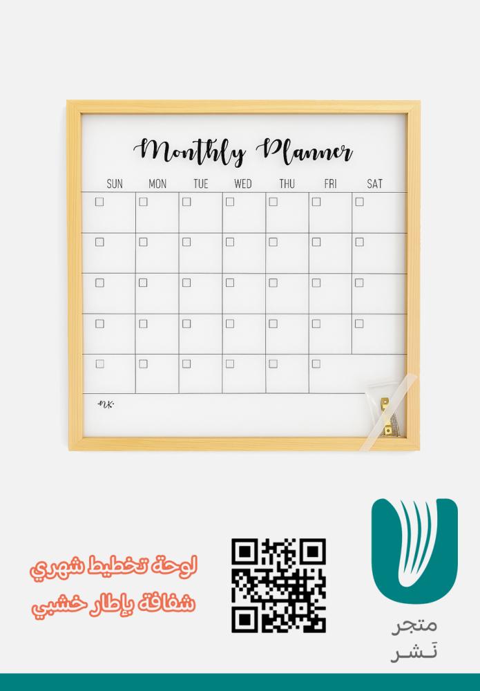 لوح تخطيط شهري أنيق بإطار خشبي طبيعي يساعدك على تنظيم أعمالك ومهامك اليومية والشهرية بوضوح واحترافية.