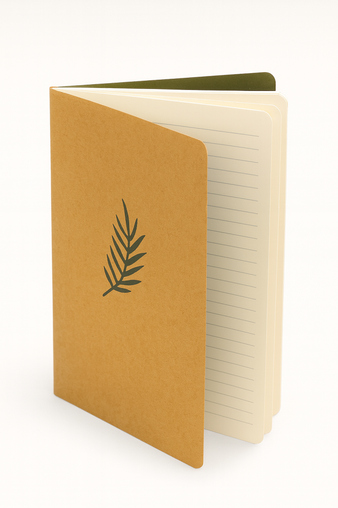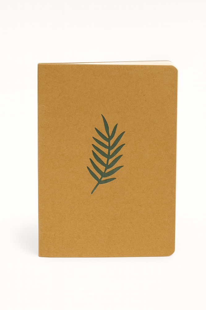 دفتر ملاحظات أنيق ومصمم بأسلوب بسيط يعكس روح الطبيعة. يأتي بغلاف كرتوني صديق للبيئة بلون بني دافئ مزين بورقة نبات خضراء تمنحه طابعاً هادئاً ومتناغماً.