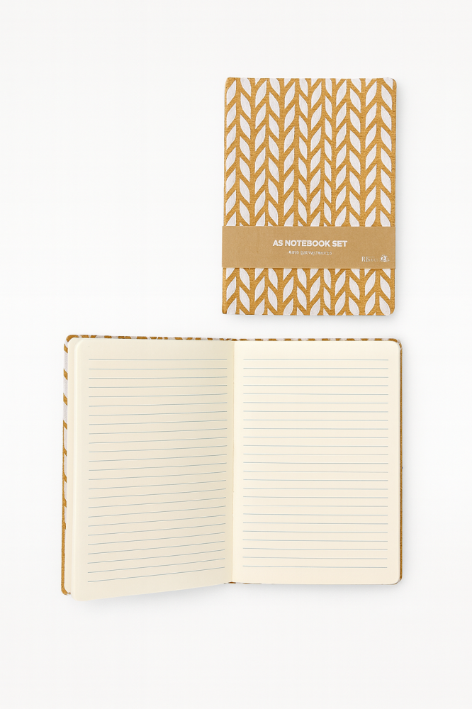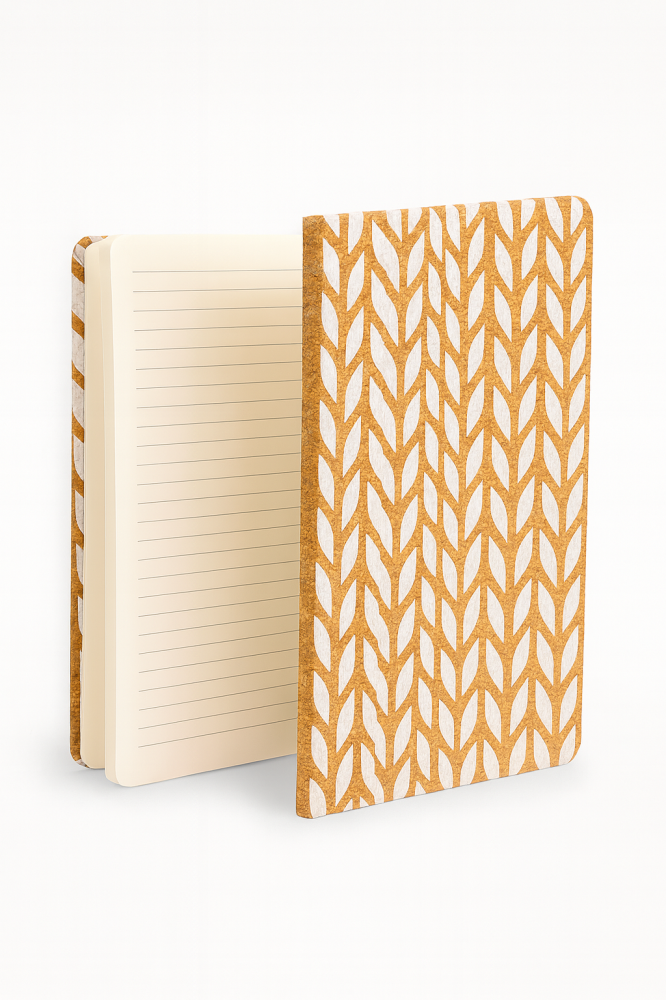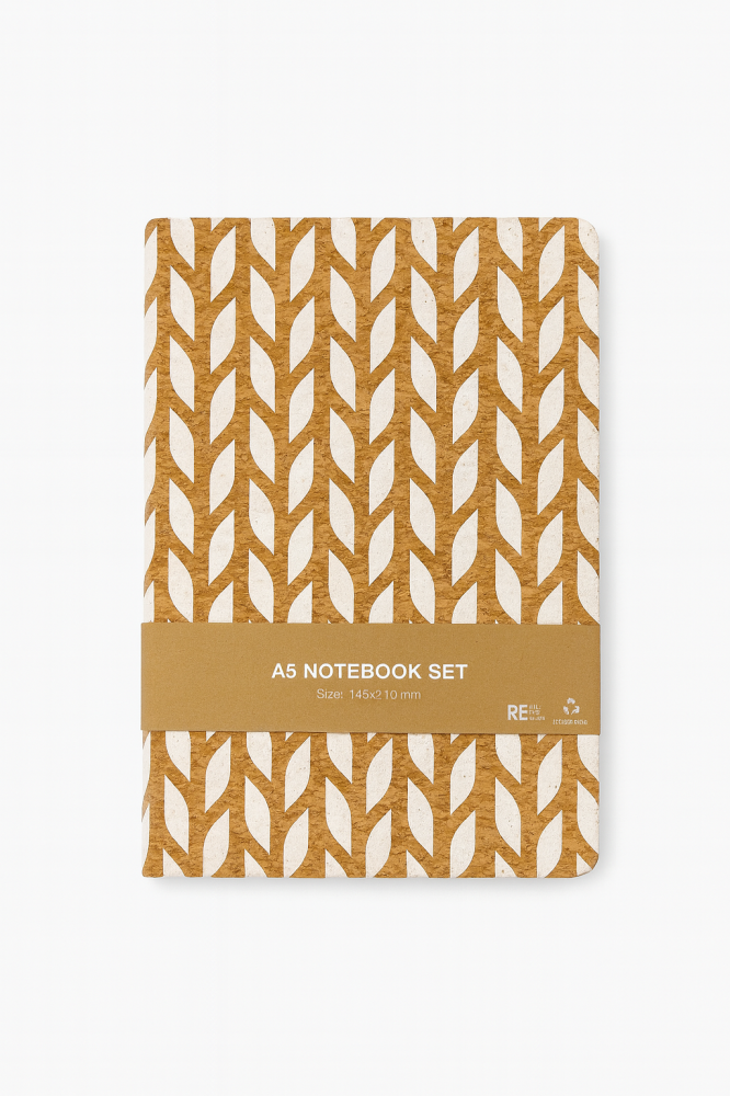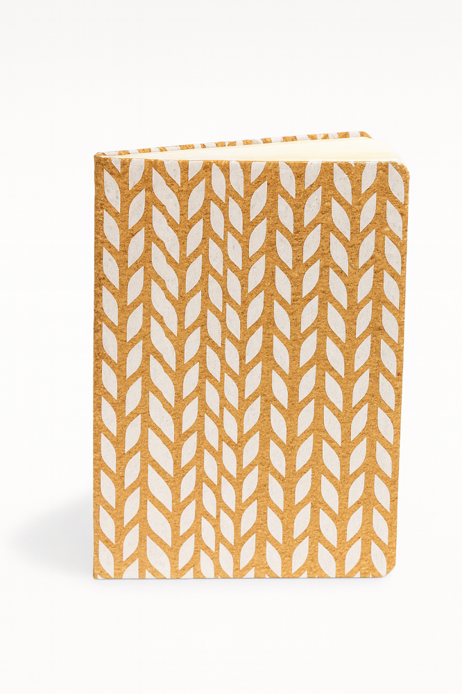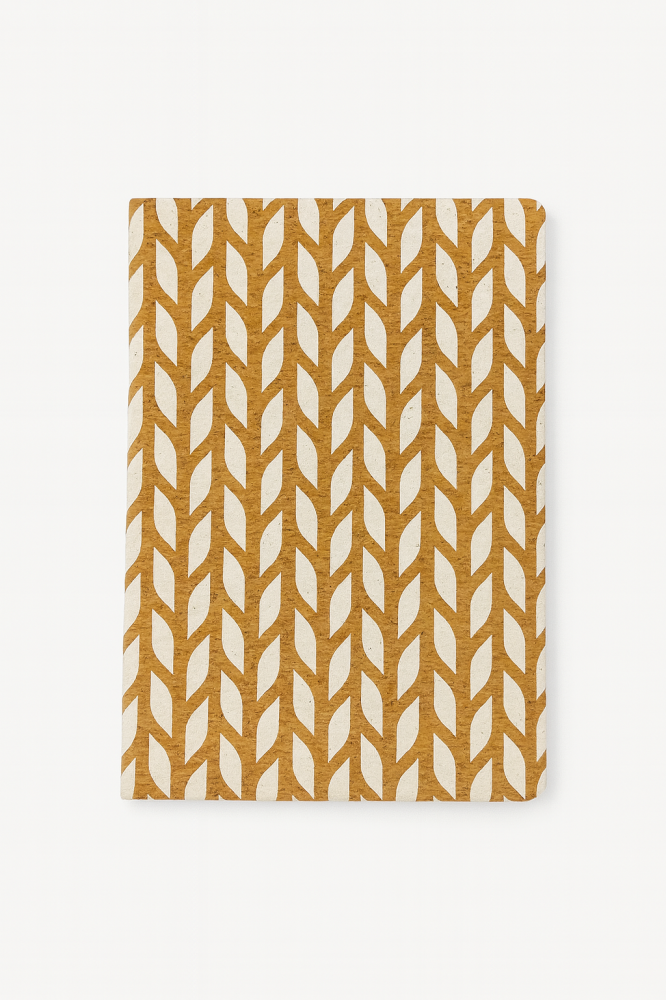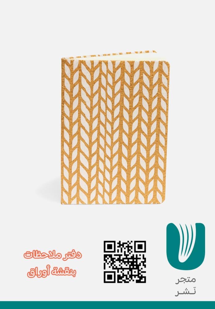 دفتر ملاحظات أنيق بتصميم عصري يجمع بين البساطة والطابع الطبيعي. يتميز بغلاف كرتوني قوي بنقشة أوراق متكررة بلون ذهبي مائل إلى البني تمنحه مظهراً دافئاً وراقياً.