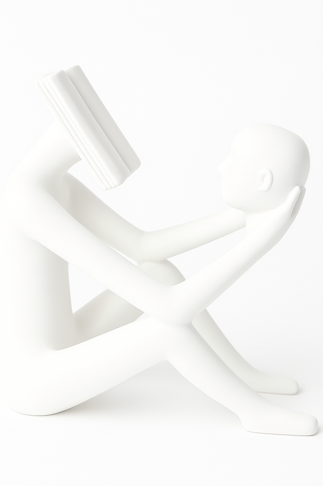قطعة فنية معاصرة بتصميم رمزي تُجسّد لحظة تأمل بين القارئ وذاته، حيث يندمج الكتاب مع ملامح الإنسان في مشهد يُعبّر عن عمق المعرفة وأثر القراءة في تشكيل الفكر. التمثال مصنوع بدقة من خامة ناعمة بلون أبيض مطفأ يمنحه طابعًا هادئًا ومجردًا، ليكون إضافة راقية لأي مكتبة أو مكتب.