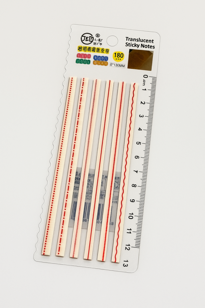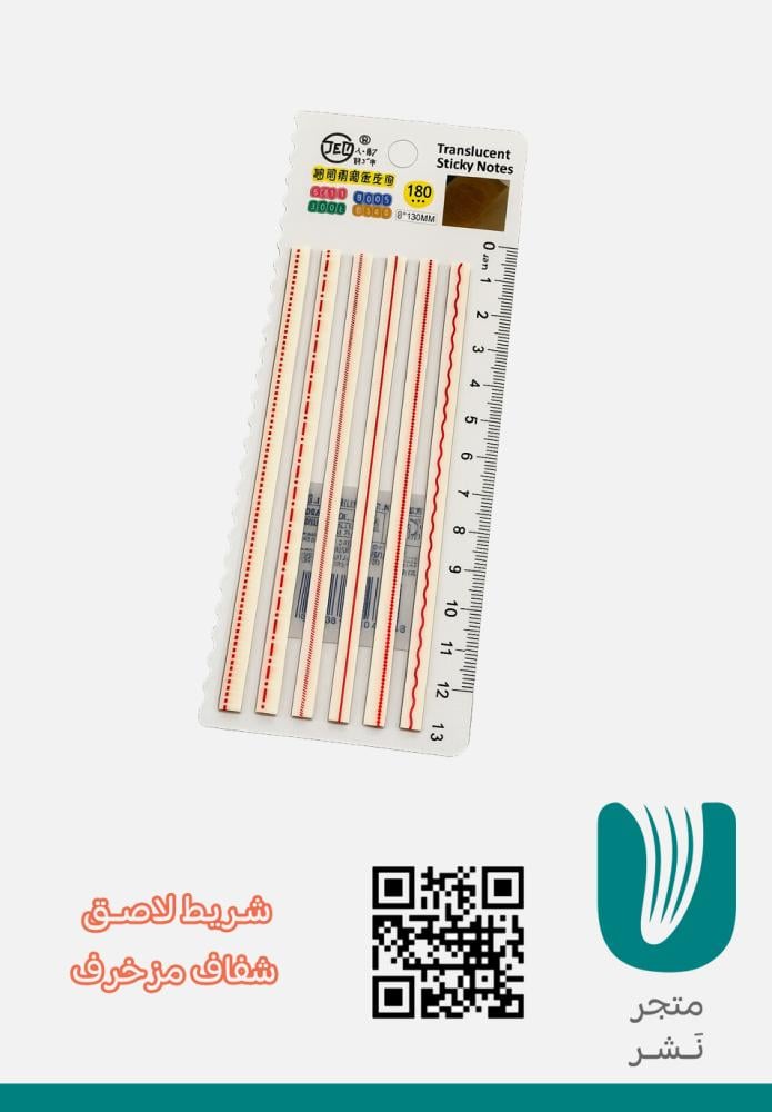 مجموعة من الأشرطة اللاصقة الشفافة المزخرفة بتصاميم متعددة الألوان والخطوط (مستقيمة، منقطة، متموجة، ونجوم)، مثالية لتنظيم الدفاتر والمذكرات أو لتزيين الصفحات والملاحظات. تتميز بخامة شفافة رفيعة لا تحجب النص، مما يجعلها خيارًا مثاليًا لهواة التخطيط (Planners) وطلاب الجامعات والمبدعين.