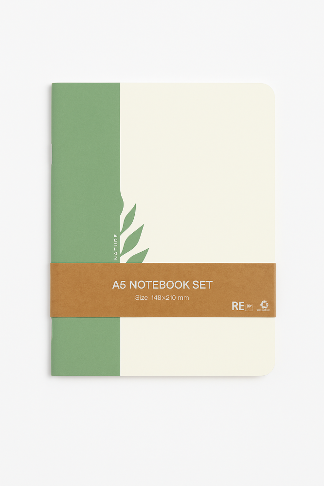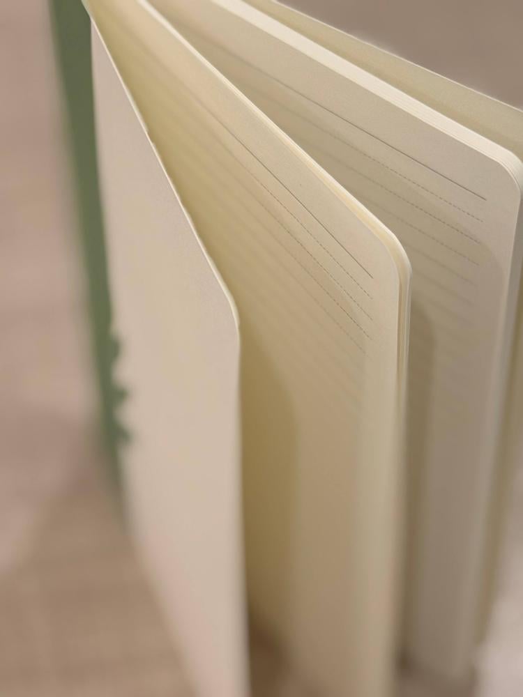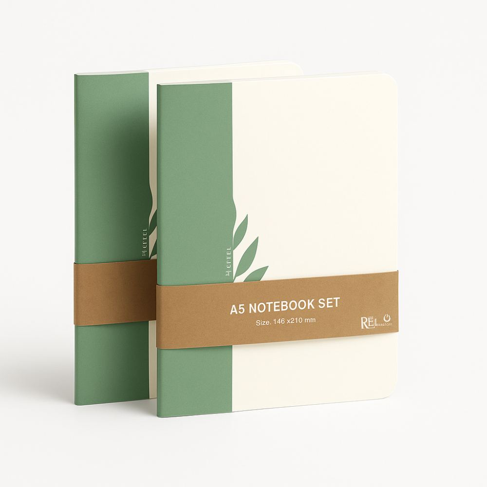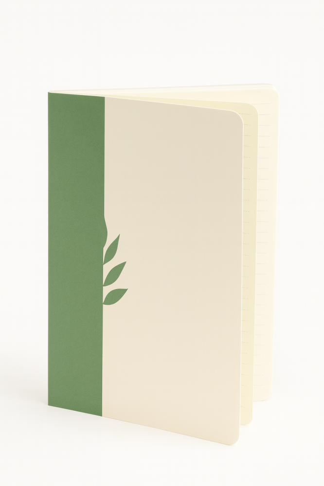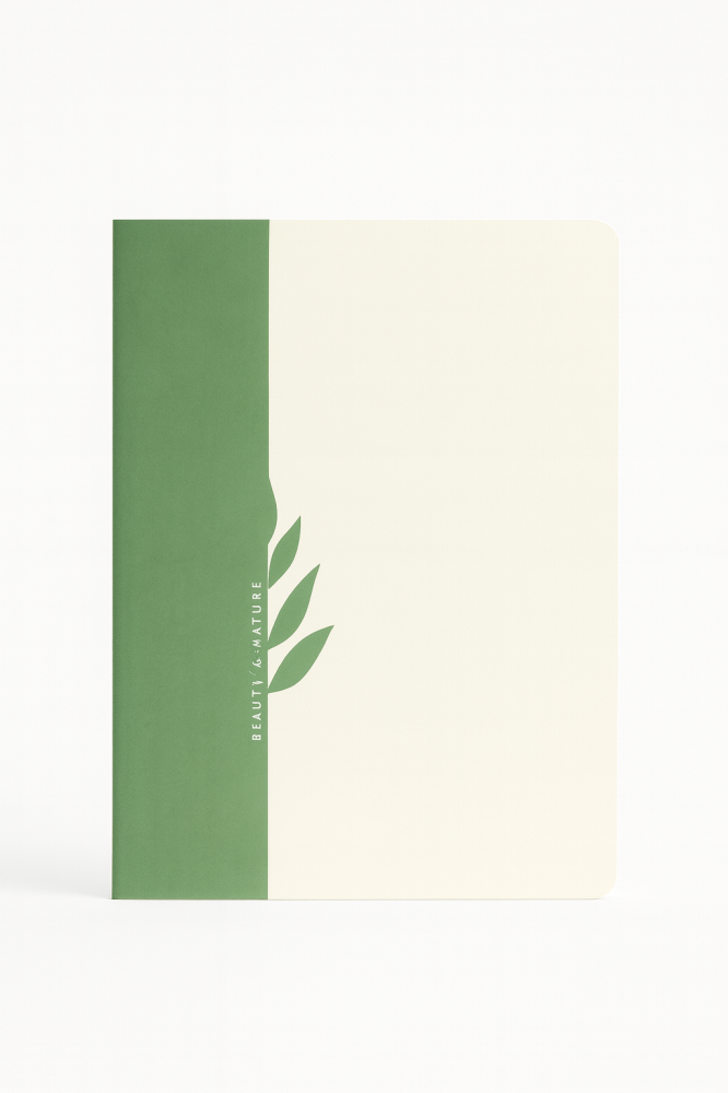 دفتر ملاحظات أنيق بتصميم حديث مستوحى من الطبيعة، يجمع بين اللونين الأخضر الهادئ والعاجي الفاتح في غلاف بسيط ومريح بصريًا.